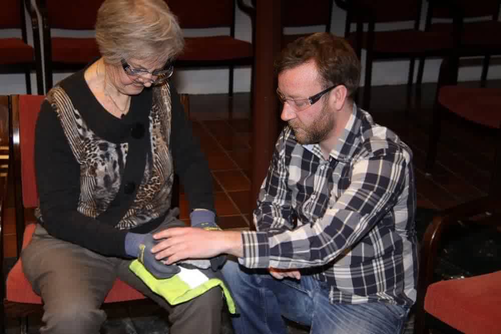 | Deltakerene fikk også anledning til å prøve oss som steinalderfolk med å slå flint. På bildet ser vi Kirsten Noddland prøve seg - er det en pilspiss hun slår mon tro. |