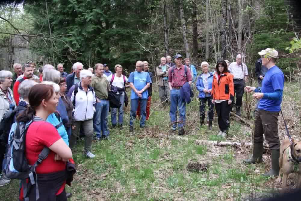 Vi gikk et par hundre meter opp i skauen, og arkeologen ba oss ta på steinalderbrillene og se for oss hvordan folk bodde her for lenge siden. Plassen befinner seg nå 40 m over havet, men for så lenge siden var det nok helt i vannkanten fortalte han. Så her fiska de i havet og jakta i skauen og bodde